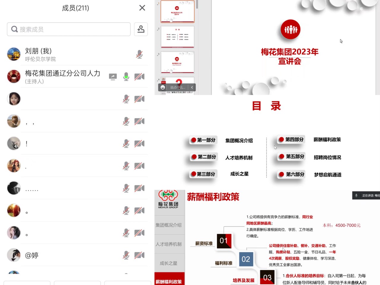 为深入学习贯彻党的二十大精神,落实党中央、国务院“稳就业”“保就业”决策部署,进一步做好公司2023届毕业生就业创业工作,解决员工就业问题,根据《365官网体育2023届毕业生校园招聘月系列活动方案》要求,2022年11月23日晚,公司联合通辽梅花生物科技有限公司于腾讯会议召开2023届毕业生线上宣讲会。化学化工公司党总支副书记刘朋、团学办公室主任张一帆、2023届毕业生辅导员孟庆永及毕业生参加了会议,会议由通辽梅花生物科技有限公司校招负责人李贺新主持。