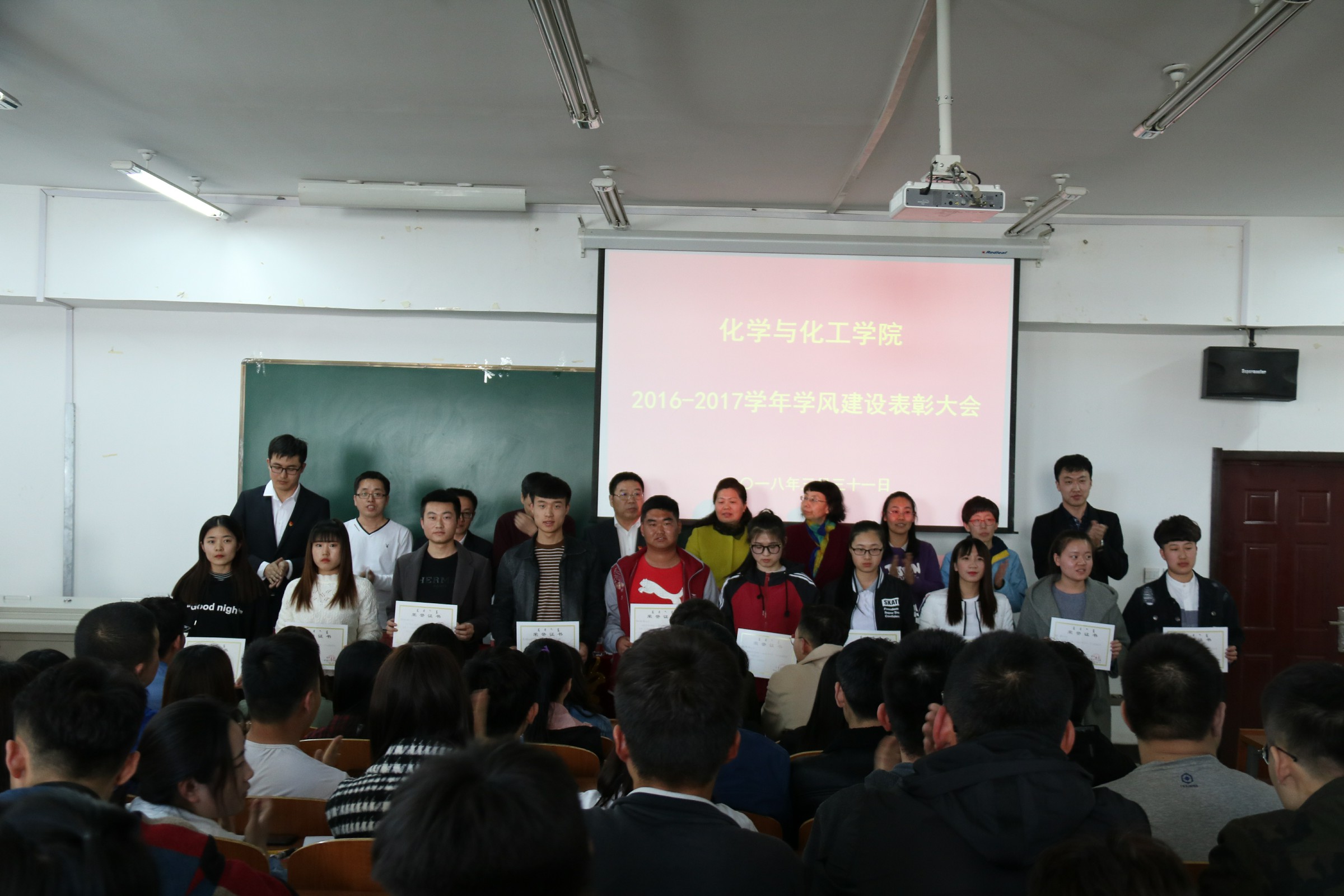 为进一步加强学风建设,积极推进学风建设活动,化学与化工公司于2018年3月31号下午在科技楼223举办化学与化工公司学风建设表彰大会。化学与化工公司党总支书记刘建华、副经理白晓艳、副经理钱广华、化学系主任郭秀芝、应用化学系主任王红菊、化学工程与工艺系主任胡日东、实验实训中心主任侴晓玉、教务科研办主任苏日娅、学工办代理主任郭长春、团总支代理书记孟庆永及200余名在校生出席本次会议。