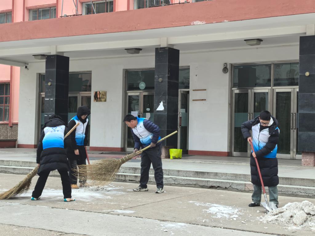 活动当日,志愿者们早早集结,身着统一的蓝白渐变志愿马甲,携带扫帚、铁锹等工具赶赴现场。尽管气温骤降,但大家的服务热情丝毫未减。现场分工明确、干劲十足:有的挥锹破除雪堆,有的持扫帚清扫散落积雪,还有的俯身清理角落垃圾。扫帚与地面的摩擦声、铁锹铲雪的碰撞声交织回荡,奏响了冬日里动人的奉献乐章
