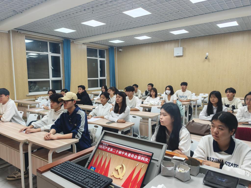 活动以“理论学习+交流分享”的形式展开:全体成员首先共同观看中国共产党第二十届中央委员会第四次全体会议公报视频,系统了解了“十四五”时期的成就与“十五五”的重要地位、发展环境以及社会发展的指导思想,为后续分享交流奠定理论基础;随后青马班学员李超然、郭斯蕊、吴家乐、丁浩天、刘嘉硕、陈玲波依次登台,结合自身专业背景、学习日常与生活实际分享个人学习感悟——既有对全会中“协同推进降碳、减污、扩绿、增长”“筑牢生态安全屏障”等内容的理解,也结合采矿专业的绿色开采技术、化学化工领域的低碳生产工艺,思考“如何将全会精神落实到学业规划、实践行动”,不少观点引发了现场成员的共鸣。